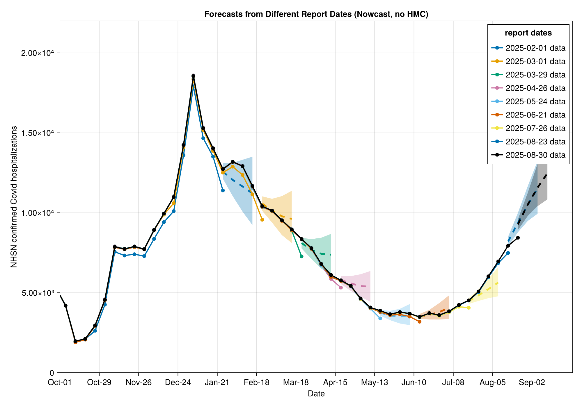 "Forecasts from Different Report Dates (Nowcast, no HMC)";