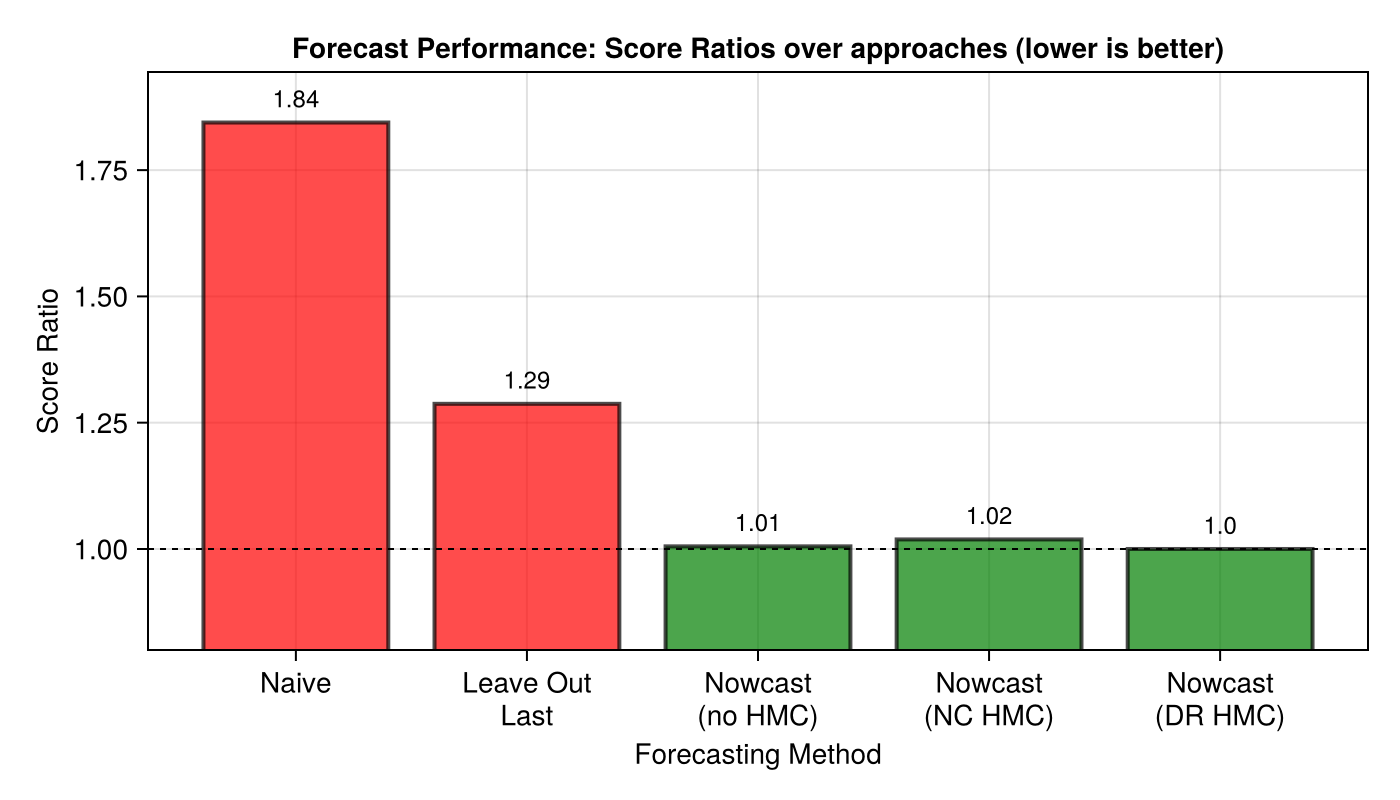 endThen we can plot these scores as score ratios relative to the best approach (nowcast with HMC step per forecast draw).