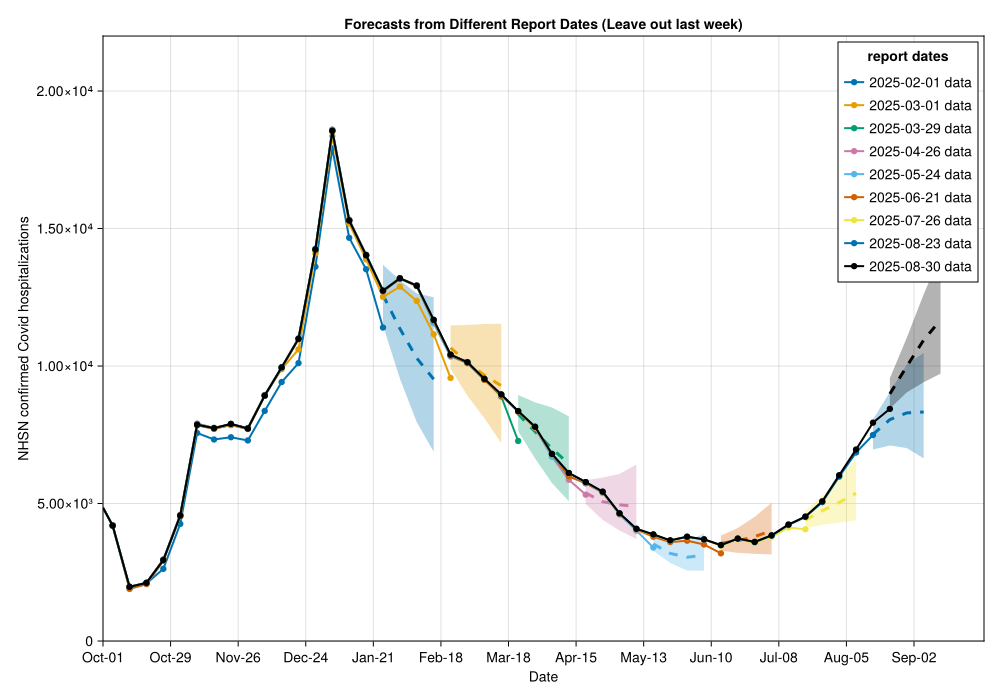 plot_with_forecasts(leave_out_last_forecasts_by_reference_date, "Forecasts from Different Report Dates (Leave out last week)";