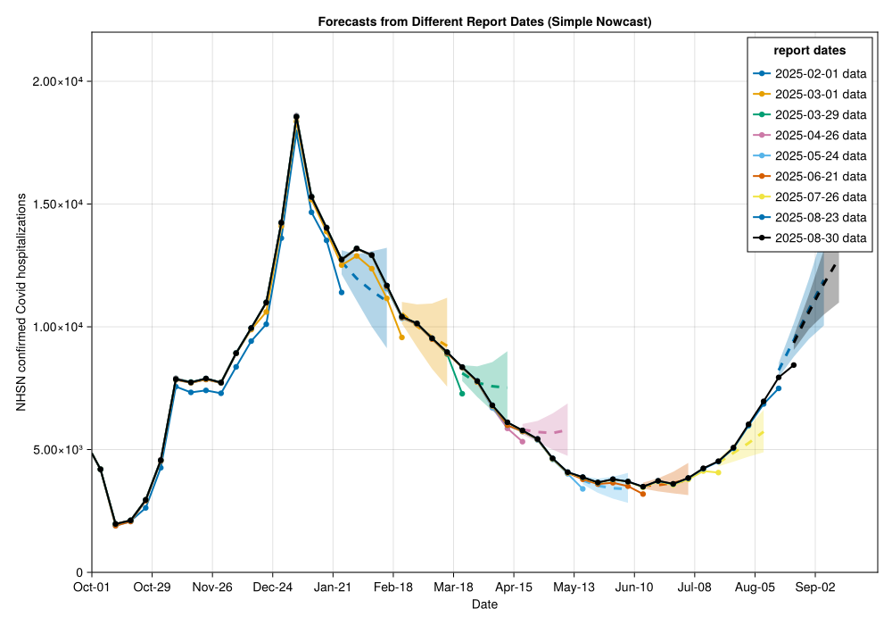 plot_with_forecasts(nowcast_forecasts_by_reference_date, "Forecasts from Different Report Dates (Simple Nowcast)";