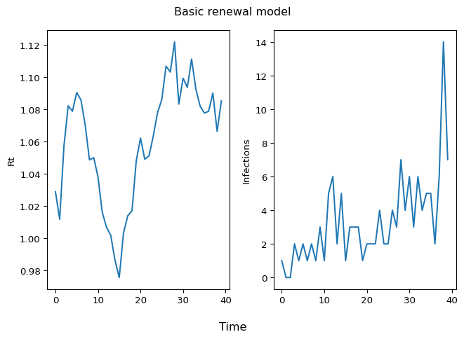 This tutorial shows the steps to build a simple renewal model featuring a latent infection process, a random walk \(\mathcal{R}(t)\) process, and an observation process for the reported infections.