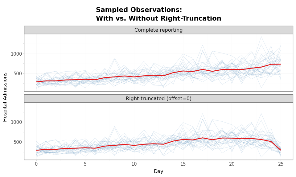 The red line is the mean across samples. In the top panel (complete reporting), the mean tracks the growing epidemic. In the bottom panel (right-truncated), the mean turns downward at the right edge — a spurious decline caused entirely by incomplete reporting.
