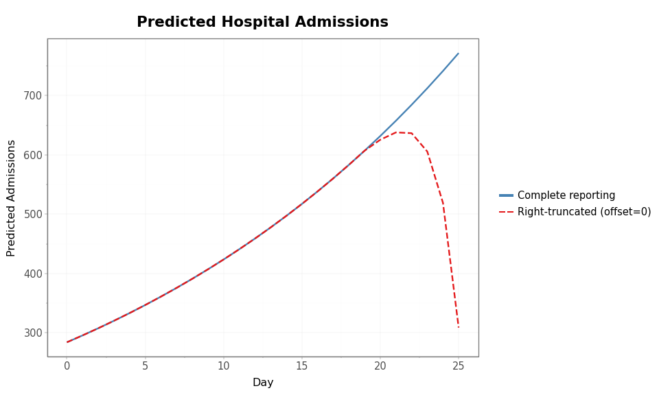 The plot below overlays predicted admissions with and without right-truncation so the early agreement and late divergence are easy to see.
