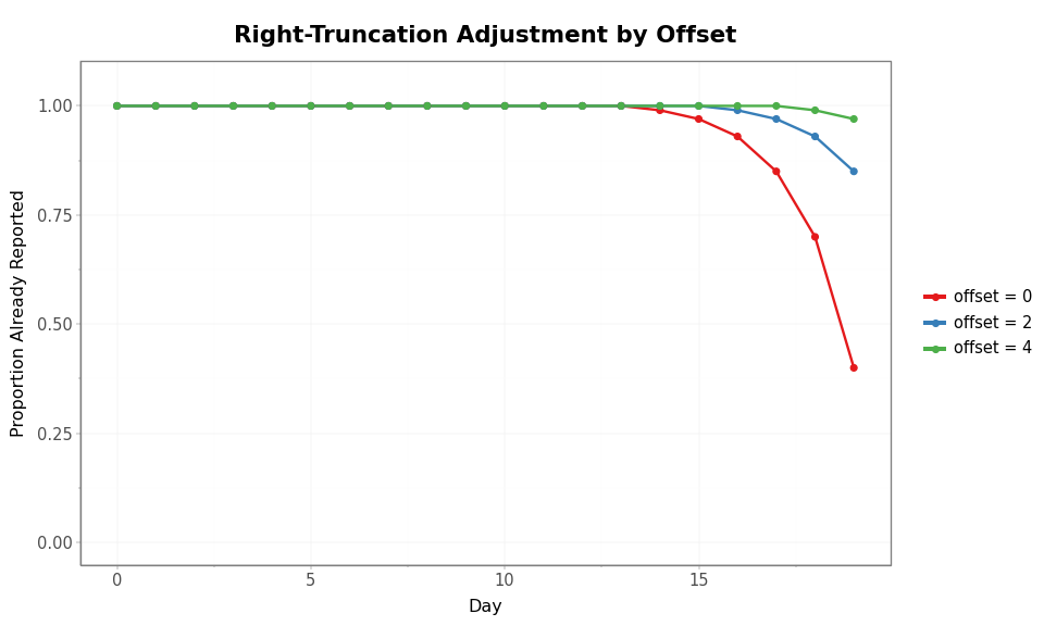 With offset 0, the most recent days are substantially underreported. Larger offsets mean more time has elapsed for reports to arrive, shifting the truncation window forward.