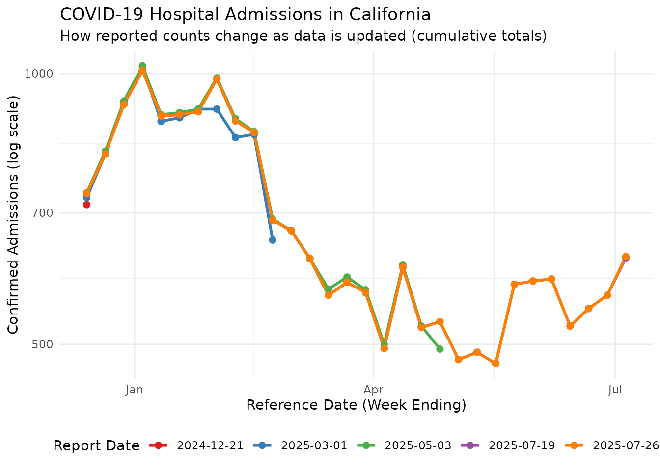 subtitle = "How reported counts change as data is updated (cumulative totals)",