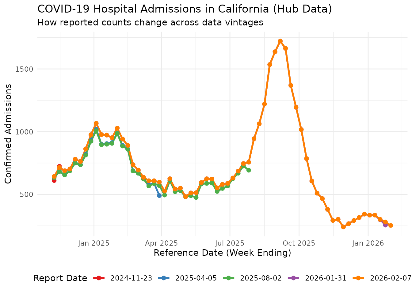 As with the Delphi source, counts for the same reference date change across vintages. Let’s visualize this for California:
