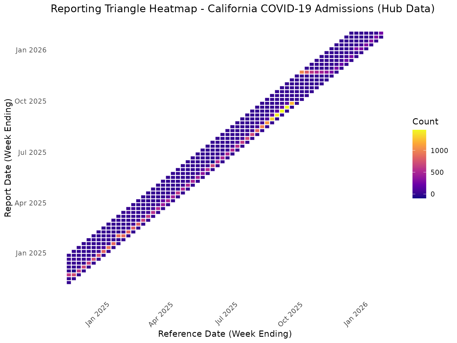 title = "Reporting Triangle Heatmap - California COVID-19 Admissions (Hub Data)",