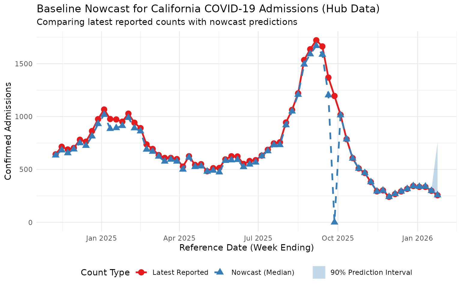 title = "Baseline Nowcast for California COVID-19 Admissions (Hub Data)",